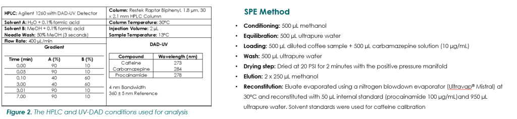 A questionnaire was used to gather data on the coffee habits and caffeine content perceptions of coffee brewed by individual participants. Coffee samples were taken directly from the brewed coffee, before the addition of milk, and diluted 1:30 in ultrapure water prior to sample clean up using a Microlute® CP HLB 96 well plate. Each sample was loaded in triplicate and processed using a positive pressure manifold (UltraPPMTM Lite) and nitrogen blowdown evaporator (Ultravap® Mistral).