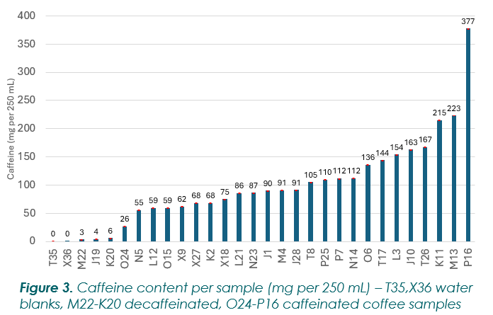 - The caffeine content of analysed samples ranged from 26-377 mg with an average of 110 mg per cup, approximately 27.5% of the recommended daily intake of 400 mg
